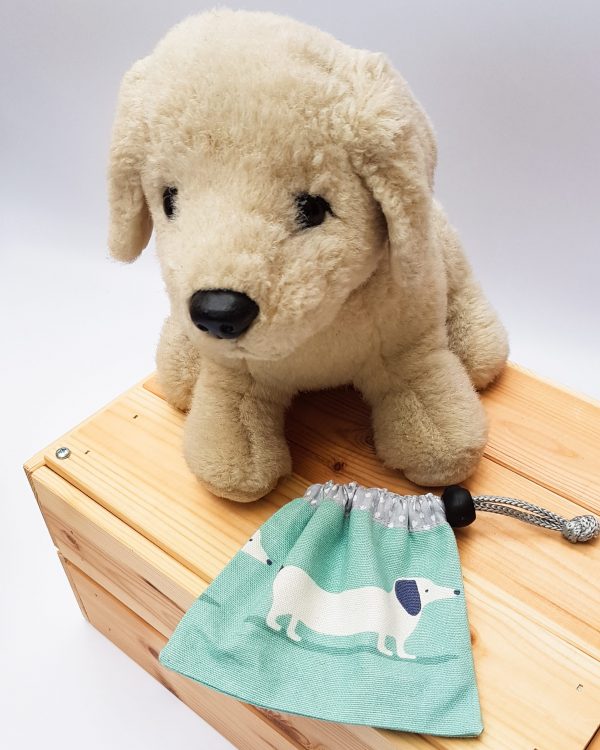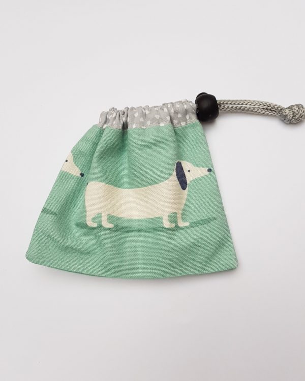 Small drawstring bag with a spring loaded toggle to close the bag securely. Made from a cotton sausage dog fabric with a contrasting lining.