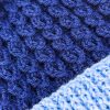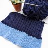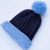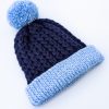 Handknit in navy aran yarn with a blue ribbed band and matching blue pom pom.